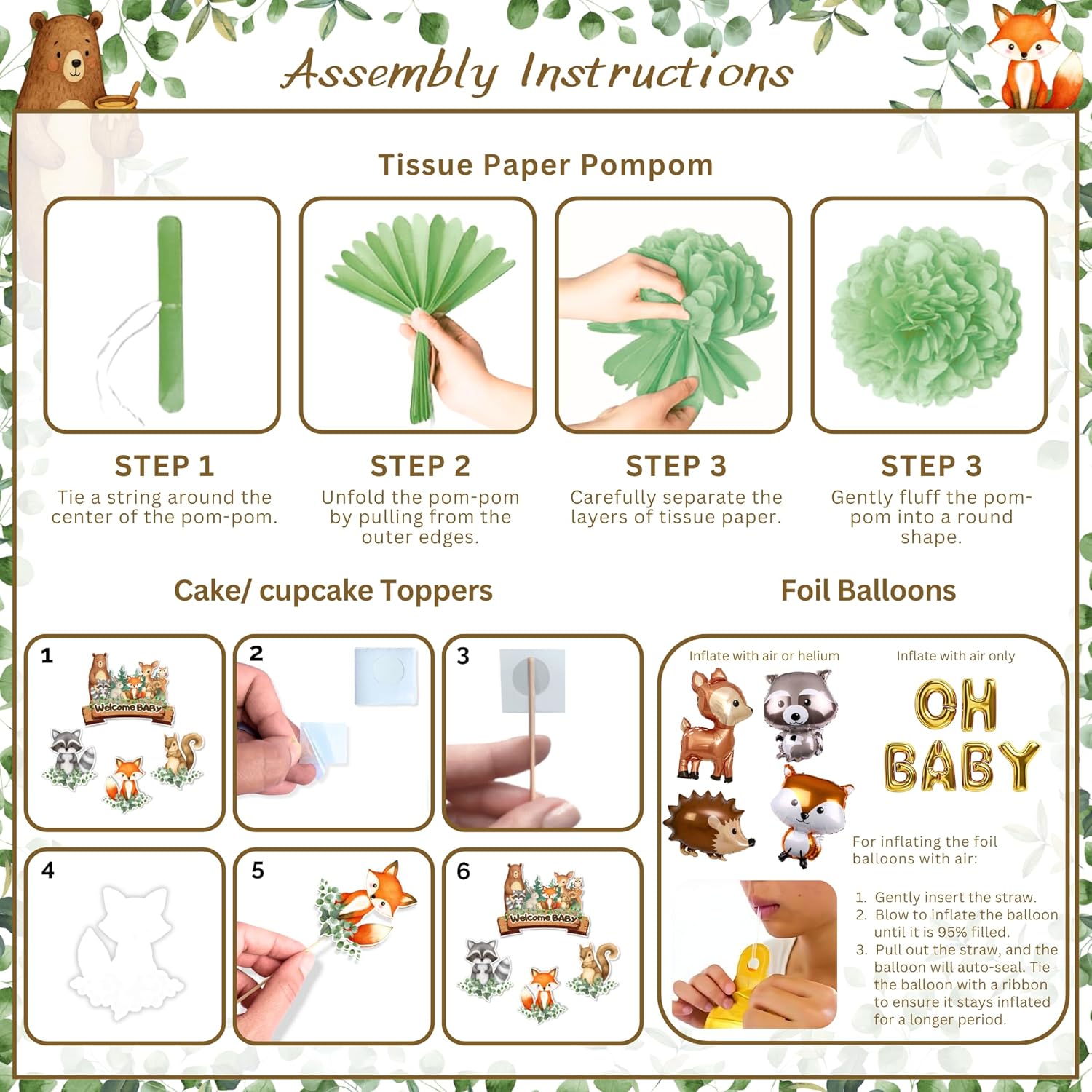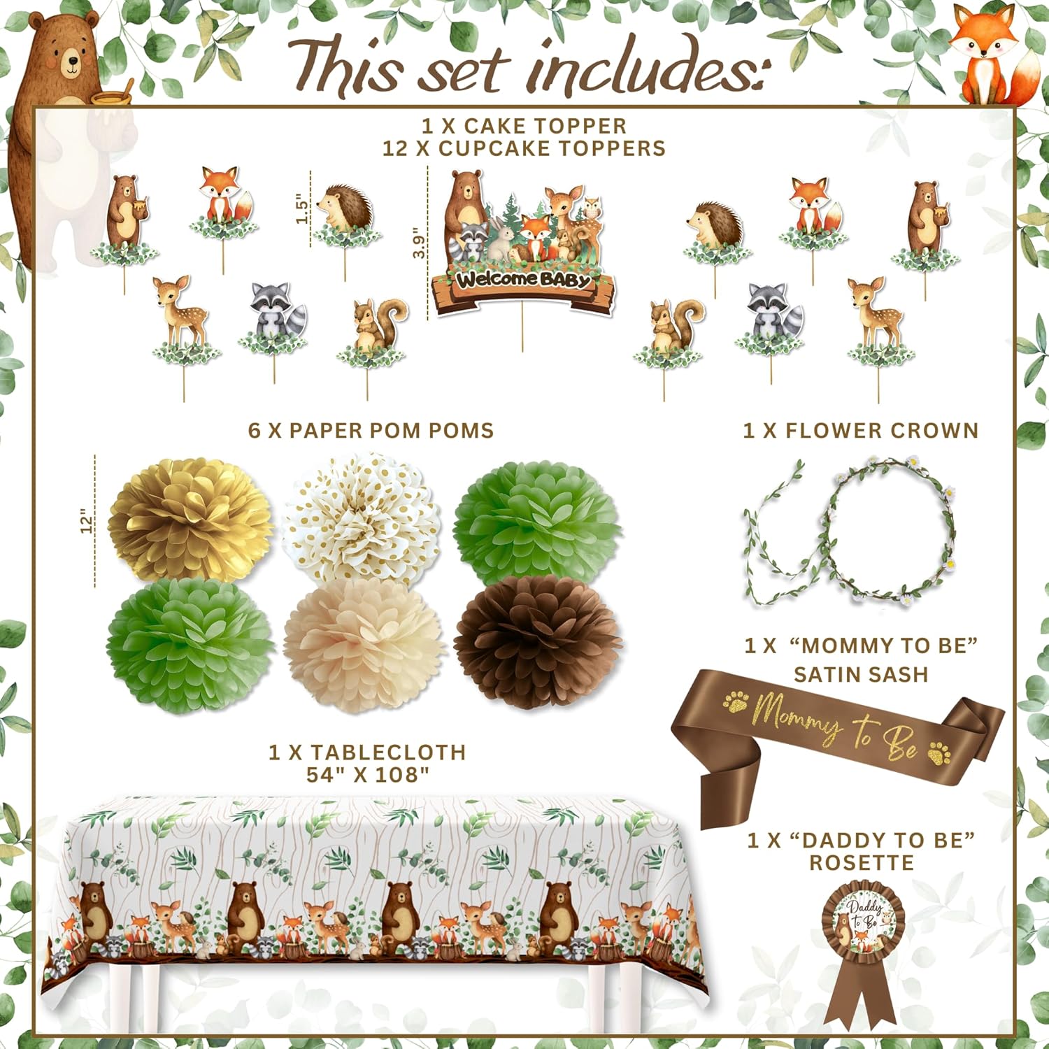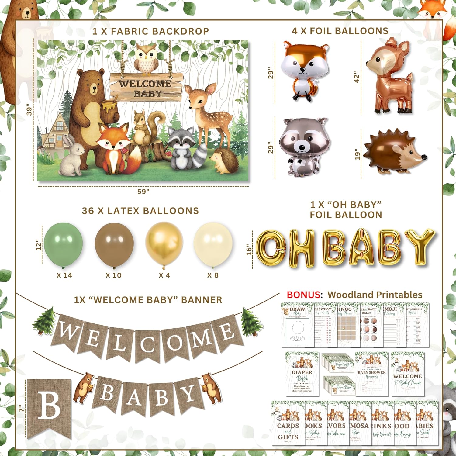 - All-in-One Woodland Animal Baby Shower Decorations: Large âWELCOME BABYâ backdrop, âOH BABYâ foil balloons, animal balloons, tablecloth, banners, cake & cupcake toppers, sash, and badge â everything for an enchanting forest baby shower