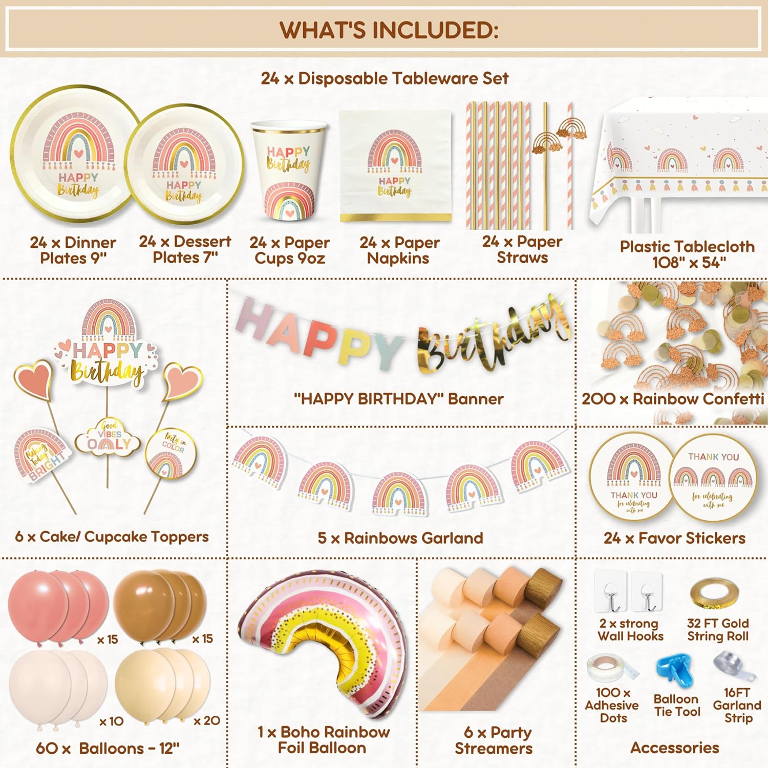 - Turn Your Party Into A Dream - Our Birthday Party Decorations in Boho Style includes everything you need to create a magical atmosphere for up to 24 guests! With the Rainbow Balloon Arch, pre-strung "Happy Birthday" banner, streamers, tableware, confetti, cake/cupcake toppers and much more, your party space will be transformed in no time