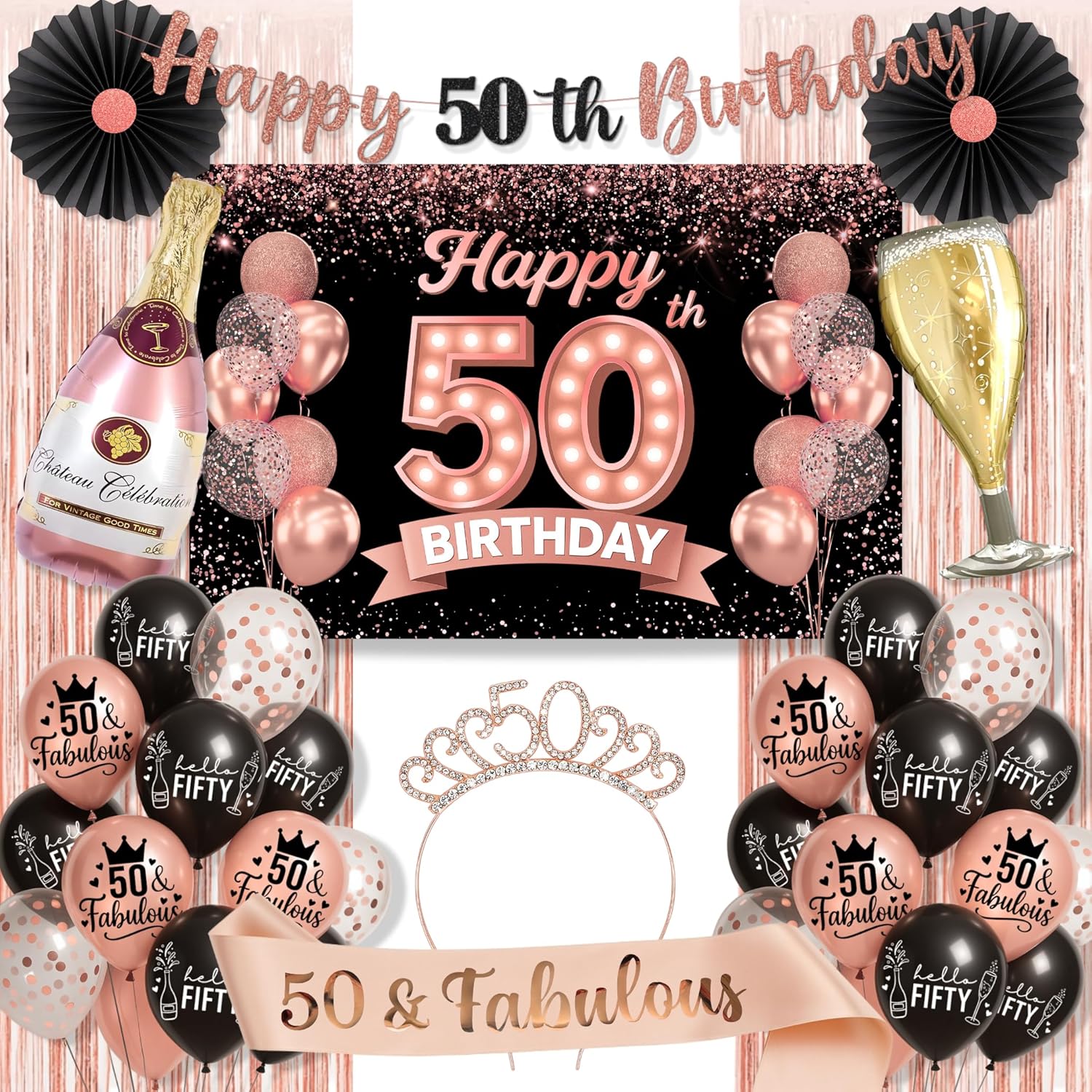 50th Birthday Decorations for Women Rose Gold Pink Black Balloons Backdrop Tiara 50 and Fabulous